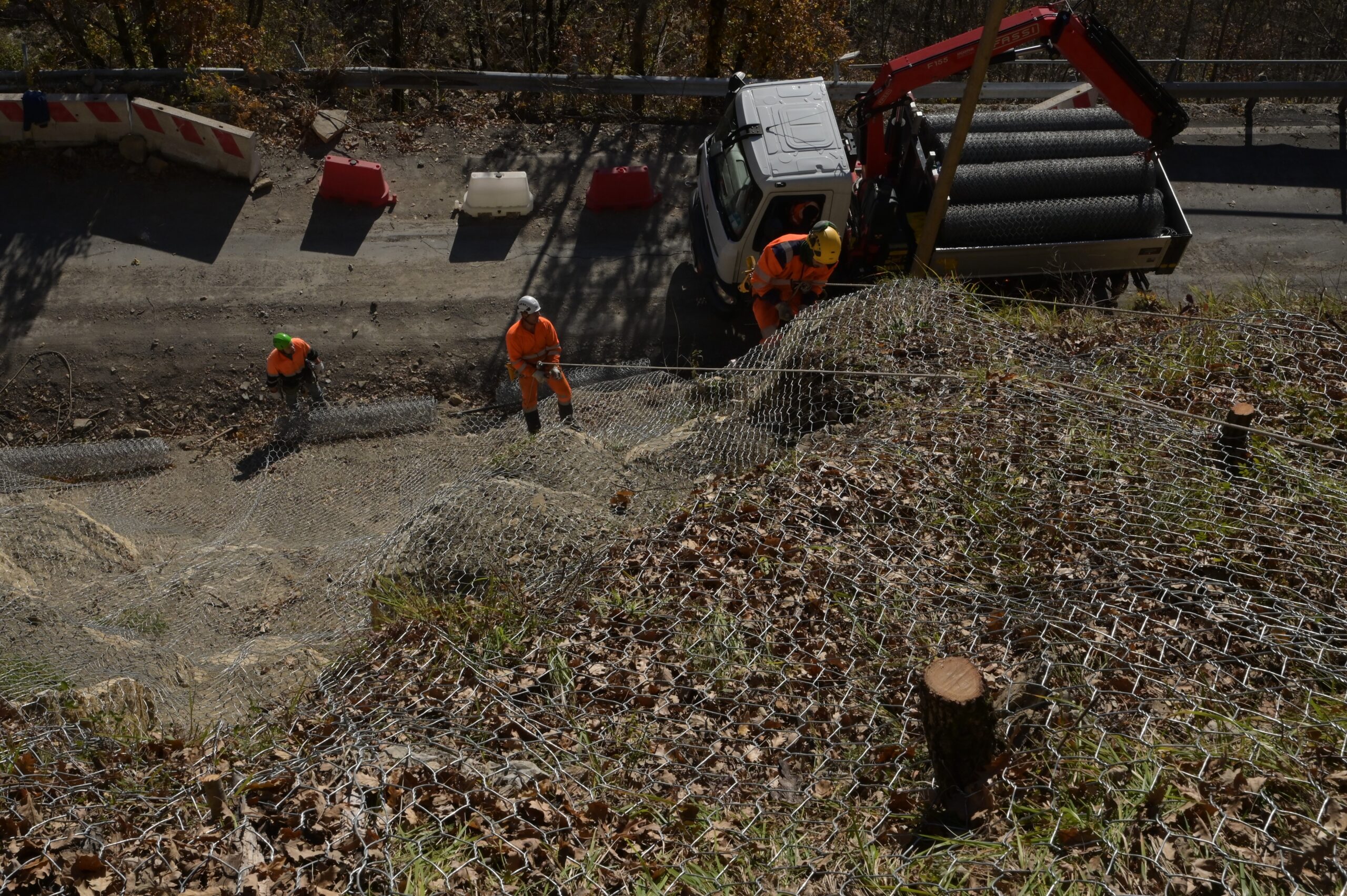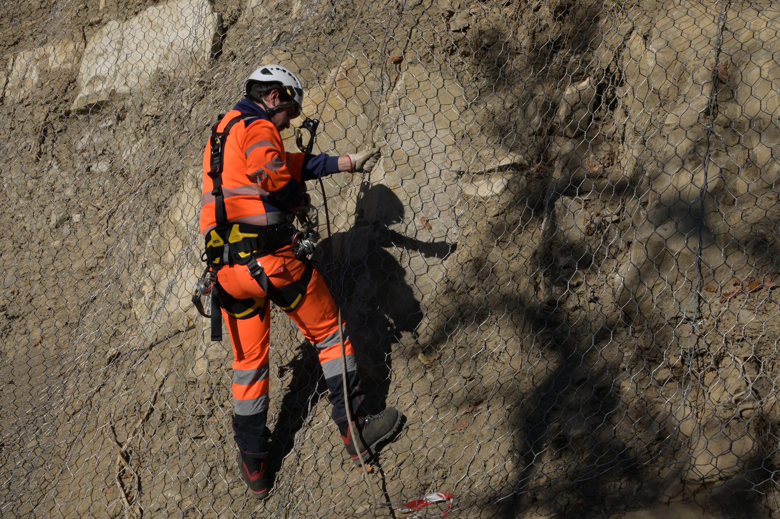 Installazione di reti metalliche per la protezione contro la caduta di massi, garantendo la sicurezza delle aree circostanti.
